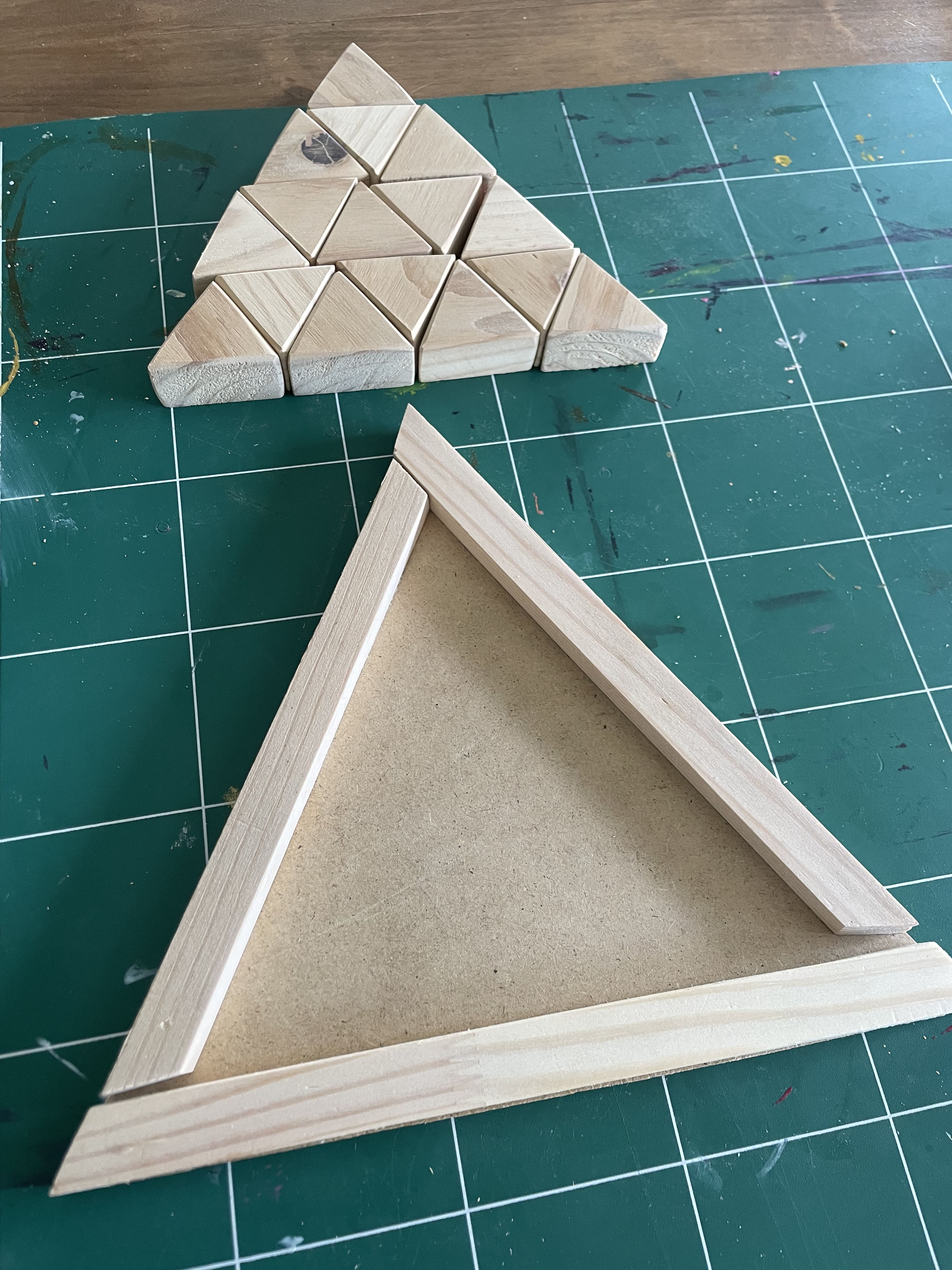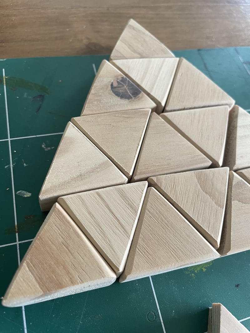 Le plus compliqué ça a été de dessiner le bon gabarit et scier les triangles à la main...